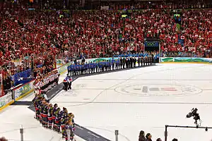 The Olympic ice hockey tournament in PyeongChang in 2018 was held without participation of NHL players, for the first time since the 1994 Winter Olympics in Lillehammer.[97] The favorites to win the gold medal were the Russians due to their domestic league, the KHL, taking an Olympic break and allowing such stars as Pavel Datsyuk and Ilya Kovalchuk to play on the team.[98][99] As a consequence of a doping scandal, the IOC banned the Russian federation, but allowed Russian athletes to compete under the Olympic flag after passing anti-doping tests.[100] The final was played between the Germans, who unexpectedly eliminated the Canadians in the semifinal,[101] and the Olympic Athletes from Russia. In the final, the Russians prevailed, defeating Germany 4–3, and won the gold medal after Kirill Kaprizov scored the winning goal in overtime. The Russian players sang the banned anthem during the medal ceremony, but the IOC decided not to pursue any action.[102] Canada won the bronze medal over the Czech Republic 6–4.[103]