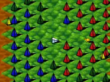 - Seekers – Mobile pyramids which consistently move towards the white pyramid. Touching one is death. They can be destroyed with fireball shots, and in some cases by luring them into hazards, but will respawn the same instant that they are destroyed unless all immobile pyramids on the field have been wiped out. Seeker types are differentiated by color (yellow, pink, light blue, light green, green, light purple, mottled, and orange), speed, AI, and "death" animation. In addition, while most seekers are destroyed with one shot, mottled seekers (called "zombies") take 3 shots to destroy, and orange seekers (called "meanies") split into halves and then quarters when shot, changing both speed and AI with each split. Though AI varies among types, all seekers move in a straight line towards the white pyramid until they encounter an object. The differences are in how the seeker acts when it encounters an object; depending on AI, it will either run into it, slowly work its way around it, or hide behind it until the white pyramid comes near.