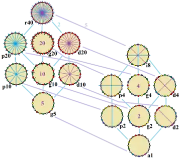 These 10 symmetries can be seen in 16 distinct symmetries on the icosagon, a larger number because the lines of reflections can either pass through vertices or edges. John Conway labels these by a letter and group order.[3] Full symmetry of the regular form is r40 and no symmetry is labeled a1. The dihedral symmetries are divided depending on whether they pass through vertices (d for diagonal) or edges (p for perpendiculars), and i when reflection lines path through both edges and vertices. Cyclic symmetries in the middle column are labeled as g for their central gyration orders.