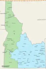 The 1st district seat encompasses the northern and most of the southwestern portion of the state. Starting at the Canada–US border, it includes all areas in the Pacific Time Zone and follows the western border to the southwestern corner. It formerly included most of the state capital, Boise, but with redistricting in 2012, northeast Ada County, including most of the Boise city limits, is in the 2nd district. Meridian, Eagle, and west Boise south of Interstate 84 remain in the first district as are all areas north of Boise, including McCall, Lewiston, Moscow, and Coeur d'Alene.[2]