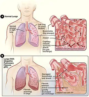 | Figure A shows the location of the lungs and airways in the body. The inset image shows a detailed view of the lung's airways and air sacs in cross-section. Figure B shows fibrosis (scarring) in the lungs. The inset image shows a detailed view of the fibrosis and how it damages the airways and air sacs.[1] | |