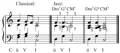 In jazz, the ii is typically played as a minor 7th chord, and the I is typically played as a major 7th chord (though it can also be played as a major 6th chord). The ii7–V7–Imaj7 progression provides smooth voice leading between the thirds and sevenths of these chords; the third of one chord becomes the seventh of the next chord, and the seventh of one chord moves down a half-step to become the third of the next chord. For example, in the key of C, the standard jazz ii–V–I progression is Dm7–G7–Cmaj7, and the thirds and sevenths of these chords are F–C, B–F, E–B; inverted for smoother voice leading, these become F–C, F–B, E–B.