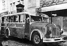 As a result of the war, there was shortage of chassis in Hungary, but at the same time there was a growing need for buses, as most of them were destroyed or severely damaged during the Siege of Budapest. The engineers were forced by the circumstances to develop a bus model without chassis.[14] The result was the model Tr 3,5 with a unibody construction in 1948, which was the first in the world of its type. Some sources suggest the German Setra S8 as the first with such unibody construction, but that model was only started to be built in 1950.[15] The small Tr 3,5 weighted only 3,7 tonnes – hence the name – and was 7.73 metres in length. The engine was produced by Rába, but at the time the company could only produce some pre-war models, that were used for their own – at this point obsolete – bus model, the Special.[16]