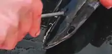Ikejime (活け締め) or Ikijime (活き締め) is a humane method of killing fish to maintain the quality of its meat.[1] The technique originated in Japan, but is now in widespread use. It involves the insertion of a spike quickly and directly into the hindbrain, usually located slightly behind and above the eye, thereby causing immediate brain death.[2] When spiked correctly, the fish fins flare and the fish relaxes, immediately ceasing all motion. Destroying the brain and the spinal cord of the fish will prevent reflex action from happening; such muscle movements would otherwise consume adenosine triphosphate (ATP) in the muscle, and as a result produce lactic acid and ammonia, making the fish sour, soggy and less tasteful.[3] Furthermore, the blood contained in the fish flesh retracts to the gut cavity, which produces a better coloured and flavoured fillet, and prolongs shelf life. This method is considered to be the fastest and most humane method of killing fish.[4] Ikejime-killed fish is sought-after by restaurants as it also allows the fish to develop more umami when aged.[5][6]