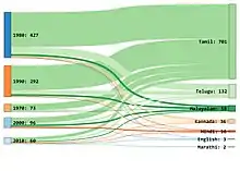 A graphical representation of the decadal split of a fairly sccurate picture of the number of films Ilaiyaraaja has worked on vs the languages he has worked in