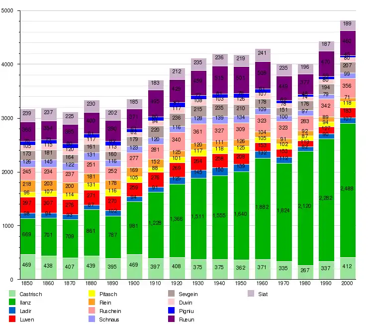 Castrisch is first mentioned in 765 as Castrices.[4] Ladir is first mentioned about 850 as Leitura.[5] Luven is first mentioned in 765 as Lobene.[6] Pitasch is first mentioned about 801–50 as Pictaui though this comes from a 16th-century copy of the lost original. In 960 it was mentioned as in Pictaso.[7] Riein is first mentioned in 765 as Renino. In 960 it was mentioned as Raine.[8] Ruschein is first mentioned in 765 as Rucene.[9] Schnaus is first mentioned about 840 as Scanaues.[10] Sevgein is first mentioned about 840 as Soviene.[11] Duvin is first mentioned about 840 as Auna. In 1290 it was mentioned as Aiuns[12] Rueun is first mentioned in 765 as Ruane. Until 1943 Rueun was known as Ruis.[13] Siat is first mentioned about 840 as Septe. Until 1943 Siat was known as Seth.[14]