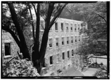 In 1761, John Cornthwaite founded a wood grist mill called the Dismal Mill, located approximately 2 miles (3 km) southeast of Ellicott City on the western shore of the Patapsco River.[3] The Ellicott family (John, Andrew, and Joseph Ellicott) settled in the area in the late 18th century, buying a two-mile section of the Patapsco in 1772 that included Ilchester and Ellicott Mills.[4] The Baltimore and Ohio Railroad (B&O) was built up the Patapsco River valley through Ilchester in 1830 (see Old Main Line Subdivision), and George Ellicott, Jr. (grandson of Andrew) built a tavern and cooper shop along the railroad.[5] The Thistle Manufacturing Company built a factory in 1837. Ilchester did not become a major stop for the B&O due to its steep grades, and the tavern was unsuccessful.[6] In 1842, mail service was started with the station name "Illchester Mills".