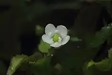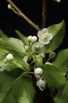 White flowers in axillary umbels with slender pedicels, dioecy. Male flower: 2 to 5 flowers each inflorescence, 2.5 to 3 mm in diameter, glabrous; 4 or 5 suborbicular petals, margin erose, corolla rotate, base slightly connate; stamens ca. 3/4 as long as petals, anthers oblong and ca. 1 mm. Female flower: 4 to 6 flowers each inflorescence, glabrous, ca. 3 mm in diameter; flowers 4-6; calyx deeply 4 to 6 lobed; corolla rotate, petals suborbicular, basal slightly connate; staminodes ca. 1 mm, sterile anthers sagittate; ovary ovoid, ca. 1.5 mm in diameter, style present, stigma thickly discoid.