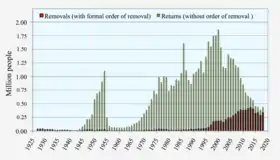 In 2017, illegal border crossing arrests hit a 46-year low, and were down 25% from the previous year.[75] NPR stated that immigrants may be less likely to attempt to enter the U.S. illegally because of President Trump's stance on illegal immigration.[76][77] The majority of illegal immigrants come from Mexico. Studies have shown that 40 million foreign born residents live in the U.S. 11.7 million of that population is illegal.[78] During the 1950s, there were 45,000 documented immigrants from Central America. In the 1960s, this number more than doubled to 100,000. In the decade after, it increased to 134,000.[79] In 2019, after being threatened with punitive tariffs, Mexico agreed to a deal with the U.S. to better stem the flow of migrants passing through the country to enter the U.S.[80] In September 2019, Mexican foreign minister Marcelo Ebrard stated that immigration to the U.S. through Mexico has decreased significantly, and that this trend is "irreversible. ... It is something that we think will be permanent.”[81]