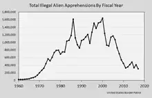 There are an estimated half million illegal entries into the United States each year.[28][82] The Pew Hispanic Center estimated that 6–7 million immigrants came to the United States via illegal entry (the rest entering via legal visas allowing a limited stay, but then not leaving when their visa period ended).[28] Illegal border crossings have declined considerably from 2000, when 71,000–220,000 migrants were apprehended each month, to 2018 when 20,000–40,000 migrants were apprehended.[22]