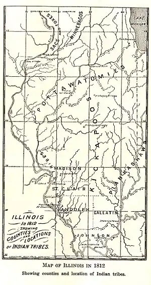 Tensions in the Illinois Territory between U.S. settlers and Native Americans were on the rise in the years before the War of 1812.[1] At Peoria, Potawatomi chief Main Poc was a supporter of the resistance movement of Shawnee prophet Tenskwatawa and his brother Tecumseh.[1] Raids against American settlers in Illinois increased after the Shawnee brothers' loss at the Battle of Tippecanoe in the Indiana Territory in 1811.[1]