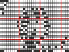 These charts use a square grid and are created by laying the grid over an existing image then colouring in all the stitches that need to be seen as raised bumps. Throughout the charting process it is still possible to see the original image and there is no distortion. These charts are different because they allow the four rows of the traditional method to be condensed into two different rows of squares. They can be used for creating very simple images, if required, but also allow much more flexibility to create works of art. The old method allowed areas to show either light or dark; the new method allows for intermediate shading, still using just two colours and only one colour in each stripe. The amount of shading depends on the number of stitches that are raised compared to the number that are lowered.