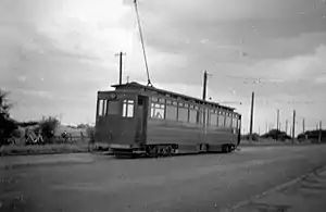Tramcars arrived from Immingham Dock down the grooved double track southern slope of one of the two "hills" on the whole line, i.e. the bridge over the conventional Grimsby District Light Railway line near Immingham East Junction.[16] This bridge, which was in regular, heavy road use in 2015, was known locally as "tramcar bridge." All cars reversed at Immingham Town, a process which took several minutes as the conductor had to unhook the rear trolley pole from the overhead wire then attach the front one, which would become the rear one on reversing. On restarting the tramcar would swing right off the public road,[17] change from grooved rails to conventional[18] and merge to become a single track[19] on a reserved way running parallel to the conventional Grimsby District Light Railway line through open, marshy farmland. Tramcars running in the opposite direction followed the same procedure in reverse.