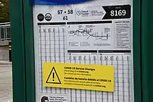 Beginning March 25, service on buses and subways was reduced due to decreased ridership during the first wave of the COVID-19 pandemic in New York City.[77][78] In April 2020, four City Council members requested that subway service be temporarily suspended due to the spread of COVID-19 in the subway system.[79] In late March, NYCTA Interim President Sarah Feinberg stated that a shutdown "feels misguided to me" and was "not on the table".[80] Feinberg also spoke in favor of hazard pay for front-line workers.[80] The following month, Feinberg called the MTA "the most aggressive transit agency in the country in acting quickly and decisively to protect our workforce."[81] Starting in May 2020, stations were closed overnight for cleaning; the overnight closures would be a temporary measure that would be suspended once the pandemic was over.[82]