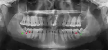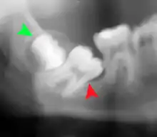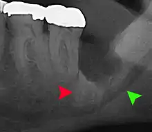 Impacted wisdom teeth is a disorder where the third molars (wisdom teeth) are prevented from erupting into the mouth.[1] This can be caused by a physical barrier, such as other teeth, or when the tooth is angled away from a vertical position.[2] Completely unerupted wisdom teeth usually result in no symptoms, although they can sometimes develop cysts or neoplasms. Partially erupted wisdom teeth can develop cavities or pericoronitis. Removal of impacted wisdom teeth is advised in the case of certain pathologies, such as nonrestorable caries or cysts.[3]