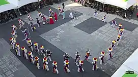 The performer wears a blue vest on a white pants.[8][15] A yellow cloth sits on the left shoulder and a red cloth on the right, with a blue cloth on the waist. The head carries a towel and a flower hat.[15] The best performer is Sang-Janggu.[17] Unlike Honam-udo nongak, one or more Janggu chibae of Honam-jwado plays Sul-Janggu’ in combination.[9][18]