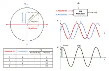 In electrical engineering, a sinusoid with angle modulation can be decomposed into, or synthesized from, two amplitude-modulated sinusoids that are offset in phase by one-quarter cycle (π/2 radians). All three functions have the same center frequency. The amplitude modulated sinusoids are known as the in-phase and quadrature components.[1] In some contexts it is more convenient to refer to only the amplitude modulation (baseband) itself by those terms.[2]