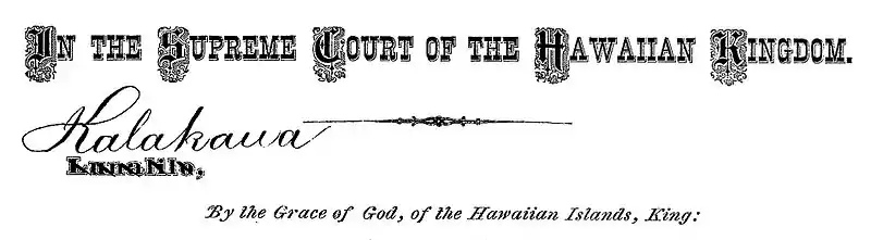Hartwell petitioned Chief Justice Charles Coffin Harris for Letters of Administration of the Kanaina Estate to be issued to William C. Parke on March 14, 1877. Harris ordered a hearing for April 5, 1877 to hear the petition pertaining to the estate of the late Charles Kanaina and anyone who could show reason not to grant it.[8] Sanford B. Dole provided a sworn affidavit to the death of Charles Kanaina and of seeing his body at his home at the Palace walk. On March 16, 1877 another Notice of Order of Petition was read and filed by Justice Lawrence McCully for William Stevens Pahukula from his attorney Edward Townsend O'Halloran. An order for a hearing on April 11, 1877 was made but canceled when the Justice discovered another hearing for another petition was already ordered.[9] Pahukula stated that he was the sole heir to the Charles Kanaina estate through Kanaina's sister, who he states was his grandmother and that the estate was indebted to him for over $3000.00.