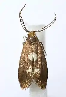 The wingspan is 12–16 mm.Head pale ochreous, ferruginous-tinged. Forewings rather dark purplish bronzy-fuscous ; a whitish triangular dorsal spot before middle, and a smaller one before tornus. Hindwings rather dark grey.[1] The moth flies from April to June depending on the location.