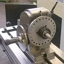 An indexing head, also known as a dividing head or spiral head,[1] is a specialized tool that allows a workpiece to be circularly indexed; that is, easily and precisely rotated to preset angles or circular divisions. Indexing heads are usually used on the tables of milling machines, but may be used on many other machine tools including drill presses, grinders, and boring machines. Common jobs for a dividing head include machining the flutes of a milling cutter, cutting the teeth of a gear, milling curved slots, or drilling a bolt hole circle around the circumference of a part.[2]