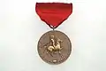 The medal of bronze is 11⁄4 inches in diameter. On the obverse is a mounted Indian facing sinister, wearing a war bonnet, and carrying a spear in his right hand. Above the horseman are the words ‘‘Indian Wars,’’ and below, on either side of a buffalo skull, the circle is completed by arrowheads, conventionally arranged. On the reverse is a trophy, composed of an eagle perched on a cannon supported by crossed flags, rifles, an Indian shield, spear, and quiver of arrows, a Cuban machete, and a Sulu kriss. Below the trophy are the words ‘‘For Service.’’ The whole is surrounded by a circle composed of the words ‘‘United States Army’’ in the upper half and thirteen stars in the lower half. The medal is suspended by a ring from a silk moire ribbon 13⁄8inches in length and 13⁄8 inches in width composed of a red stripe (1⁄4 inch), black stripe (3⁄16 inch), red band (1⁄2inch), black stripe (3⁄16 inch), and red stripe (1⁄4 inch).[1]
