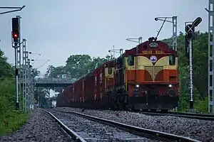 From 2009 onward they are equipped with Daulat Ram DBR, microprocessor control and an Auxiliary Power Unit (APU) in the short hood thus they bear external resemblance to the WDM-3D class.[2][3] The WDG3A has higher Tractive Effort (7.5 t more) and Axle Load (1.7 t) compared to the WDM3A eventhough they have the same engine and horsepower rating. Many units of this class has been named "shakti" and can easily be recognized by their orange livery with cream stripe & lightning bolts. Besides IR, WDG-3A are being use by private companies for industrial uses, thermal power plants, port trusts etc.