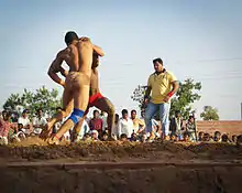 Grappling arts (malla-vidya), practiced either as sport or fighting style, are found throughout the Indian subcontinent. True combat-wrestling is called malla-yuddha, while the term malakhra refers to wrestling for sport. Malla-yuddha was codified into four forms which progressed from purely sportive contests of strength to actual full-contact fights known as yuddha.[57] Due to the extreme violence, this final form is generally no longer practised. The second form, wherein the wrestlers attempt to lift each other off the ground for three seconds, persists in Karnataka. Traditional malla-yuddha is virtually extinct in the north where it has been supplanted by kusti, but another form called malakhra still exists in parts of India and Sindh, Pakistan. Vajra-musti was another old grappling art in which the competitors wrestled while wearing a horned knuckleduster. In a later style called naki ka kusti (claw wrestling), the duellists fought with bagh nakha.[64] Numerous styles of folk wrestling are also found in India's countryside, such as mukna from Manipur, Inbuan wrestling from Mizoram and Khomlainai among the Bodos.