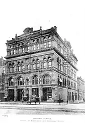 The first temple suffered from serious construction defects and was demolished in 1873. It was replaced by an imposing red-brick Romanesque structure on the same corner, officially opened in 1875. The second temple was designed with ample rental space on the first two floors to generate income. Renters would eventually include a cleaners and a Turkish bath, along with several offices.[7] There were ceremonial and social rooms for five Masonic lodges on the upper floors. However, late in the design process it was noted with great alarm by the state's Masons that the architects had neglected to create an appropriately large meeting hall for the annual meetings of hundreds of lodge officers each year. The Grand Lodge was forced to hurriedly purchase an adjoining lot immediately to the south to attach an architecturally incongruous assembly hall to the backside of the building. After an initial estimate of under $70,000, the total cost of the project was $120,000. The embarrassing errors and cost overruns, combined with the great economic Panic of 1873 nearly bankrupted the Grand Lodge.
