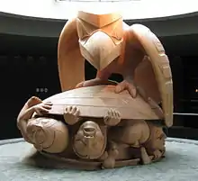 Natsilane was a great hunter and carver. He also hunted with respect for the sea lions he killed. His older brothers-in-law were jealous of his talents. One day when they had paddled far out to a sea lion rock to hunt, Natsilane speared a sea lion but it dove into the water breaking off the spear tip. When he looked back to the canoe, his older brothers-in-law were paddling away, against the protests of his youngest brother-in-law. Natsilane in despair went to sleep on the rock, and was woken by the chief of the sea lions. He was brought to live in their village beneath the sea. It turned out that he had speared the sea lion chief's son, so Natsilane saved the boy by removing the spearhead from his side. In thanks, the sea lions sent him home in an inflated sealskin bladder. Once home, he visited his wife in secret and had her bring him his carving tools. He set about carving a killer whale, an animal that had yet to exist. First he tried spruce, but that sank when he placed it in a tide pool. Next, he tried hemlock, which also sank. He then tried red cedar, which circled, but then also came to rest on the bottom of the pool. Finally, he tried yellow cedar, his best carving yet. This jumped from the tide pool out to sea. He called the first killer whale back to him and told it to kill his older brothers-in-law when they next went in their canoe to hunt, but to save the youngest brother-in-law. The killer whale capsized the canoe, drowning the older brothers-in-law but brought the youngest back to shore on its back. When the killer whale returned, Natsilane instructed the whale to never again harm humans.[2][3]