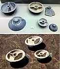 Stone palette, also called "toilet tray" or "cosmetic trays") is a round tray commonly found in the areas of Bactria and Gandhara, and which usually represent Greek mythological scenes. Some of them are attributed to the Indo-Greek period in the 2nd and 1st century BCE. A few were retrieved from the Indo-Greek stratum No.5 at Sirkap. Some stone palettes with some very pure Hellenistic designs are thought to date to circa 100 BCE, and to have come from Taxila.[46] Other have mythological themes, such as the Rape of Europa, which "could have only been made by a Greek patron during the Indo-Greek period".[47]
