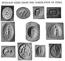 Intaglio gems from northwest India, showing an evolution from Greek workmanship to more degraded forms, range from circa 2nd century BCE to 2nd century CE.[48]