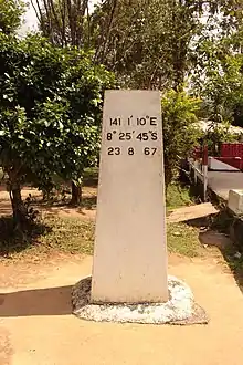 The border starts in the north at northern coast of New Guinea, immediately west of the Papuan village of Wutung and Mount Bougainville.[2] It then proceeds in a straight vertical line to the south along the 141st meridian east, cutting across the Oenake Range, the Kohari Hills, the Bewani Mountains, the Border Mountains and the Central Highlands. Upon reaching the Fly River it then follows this in a C-shaped curve, before continuing in a N-S line at 141º 01'10" meridian east, cutting across the Kai Lagoon, down to the estuary of the Bensbach River with the Torres Strait on the southern coast of New Guinea.