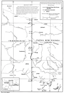 The Indonesia-Papua New Guinea border is the international border between Indonesia and Papua New Guinea. The border, which divides the island of New Guinea in half, consists of two straight north–south lines connected by a short section running along the Fly river, totalling 824 km (512 mi).[1] The boundary separates Papua province of Indonesia from Sandaun and Western provinces of Papua New Guinea.