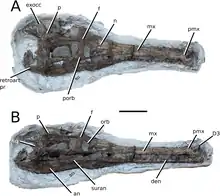 Indosinosuchus ("Indochinese crocodile") is a genus of teleosaurid neosuchian that lived during the Late Jurassic in what is now Thailand. It contains two species, the type species I. potamosiamensis and I. kalasinensis, both recovered from the lower Phu Kradung Formation.[2][1][3] The age of Indosinosuchus is unclear, as vertebrate fossils like Indosinosuchus support a Late Jurassic age, while palynological data suggests an Early Cretaceous (Berriasian) age.[3][4]