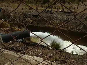 Additionally, the geologic formations that harbour economically valuable metals such as copper and gold very often consist of sulphide-type ores. The processing entails grinding the rock into fine particles and then extracting the desired metal(s), with the leftover rock being known as tailings. These tailings contain a combination of not only undesirable leftover metals, but also sulphide components which eventually form sulphuric acid upon the exposure to air and water that inevitably occurs when the tailings are disposed of in large impoundments. The resulting acid mine drainage, which is often rich in heavy metals (because acids dissolve metals), is one of the many environmental impacts of mining.[10]