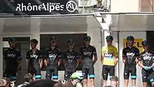 As the Tour de France began, the team lead with a two-pronged attack, incumbent champion Froome hoping for a fourth straight grand tour win and fifth overall title and Thomas reigning Dauphiné champion and super-domestique in previous editions of the race. By the end of the first week of racing Thomas had rode a flawless race and was second overall, only six seconds behind Greg Van Avermaet. Froome on the other hand was 14th, over a minute behind the Belgian race leader.[250] Thomas and Froome both lost time to Van Avermaet on stage nine as the race transitioned across the cobbles of Roubaix, with Thomas 43 seconds and Froome 1' 42" behind the race leader. By the end of stage 10 these deficits had grown to 2' 22 for Thomas and 3' 21" for Froome.[251] As the race entered the Alps Thomas would cement his control on the race and the team, claiming consecutive victories at the summit finishes of La Rosière and Alpe d'Huez. By the end of stage 12 Thomas lead had grown to 1' 39" over team-mate Froome.[252][253] Colombian prodigy, Bernal, in his first grand tour of his career was 19th overall 21' 22" behind Thomas.[254] Following the 15th stage, controversy arouse around Gianni Moscon, who had been seen punching Fortuneo–Samsic rider Élie Gesbert during the opening kilometres of the stage. After reviewing footage of the incident, the race jury disqualified him for 'particularly serious aggression', leaving Sky with 7 riders for the remaining stages.[255][256] On stage 17 Froome cracked, slipping to third overall 2' 31" behind Thomas. This promoted Giro d'Italia runner-up, Tom Dumoulin, to second overall 1' 59" behind Welshman Thomas.[257] Thomas would ultimately win the race overall, and the team would record their fourth consecutive grand tour win, fifth Tour de France title and second successive year achieving more than one grand tour win.[258] Thanks to his second-place performance on the penultimate day time trial, Froome joined Thomas on the final podium finishing third overall.