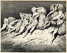 Relating this sin of incontinence to the two that preceded it (lust and gluttony), Dorothy L. Sayers writes, "Mutual indulgence has already declined into selfish appetite; now, that appetite becomes aware of the incompatible and equally selfish appetites of other people. Indifference becomes mutual antagonism, imaged here by the antagonism between hoarding and squandering."[51] The contrast between these two groups leads Virgil to discourse on the nature of Fortune, who raises nations to greatness and later plunges them into poverty, as she shifts, "those empty goods from nation unto nation, clan to clan".[52] This speech fills what would otherwise be a gap in the poem, since both groups are so absorbed in their activity that Virgil tells Dante that it would be pointless to try to speak to them – indeed, they have lost their individuality and been rendered "unrecognizable".[53]