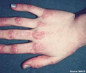 | Gottron's papules on the hand of a patient with juvenile dermatomyositis. | |