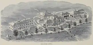 Completed in 1868, the hotel cost Mr. Davis a total of $162,000 (approximated $3.6 million in 2016 US Dollars), but following the Panic of 1873 was sold at auction to one N.S. Chandler "for a little less than $30,000".[8] The hotel, which featured a farm, telegram station, gasworks, and railway stop, was short-lived however, and closed in the winter of 1874 due to low attendance in the midst of an economic depression.[10] The hotel was razed by fire on July 25, 1875, with some indication that the blaze "was the work of an incendiary".[11][12] The hotel and its contents were insured in total for $20,000.[13] Though the hotel itself stood on the shores of the Connecticut for less than a decade, the Ingleside name would persist as that of the surrounding area long after its absence.[14]