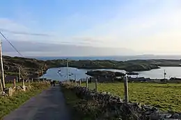 Inishbofin lies around 8 kilometers (5.0 mi) off the Connemara coast opposite of Ballinakill Harbour and Cleggan Bay. It is separated by a narrow channel from Inishark (Shark island).[4] It is about 5.5 km (3.4 mi) long and 3 km (1.9 mi) wide. The highest point is in the Westquarter and rises to 292 feet (89 metres).[5]