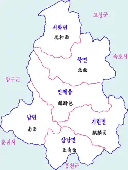 Inje-eup (인제읍) is a town in and the seat of the county of Inje, Gangwon Province, South Korea. The town has a surface area of 315.15 km2 (121.68 sq mi) and a population of 9,961.
