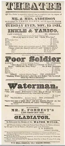 The opera was highly successful, performed 98 times at the Haymarket Theatre, and a total of 164 performances on London stages by 1800. One of the most famous actresses to play the part of Yarico was Elizabeth Satchell, while Arabella Menage played Patty in an early production. There were also performances in Dublin (1787), Jamaica (1788), New York (1789), Philadelphia (1790), Calcutta (1791), Boston (1794), and Charleston (1794).[2]