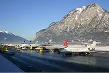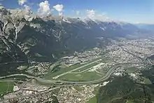 Innsbruck Airport (IATA: INN, ICAO: LOWI), also known locally as Kranebitten Airport, is the largest international airport in Tyrol in western Austria. It is located approximately 4 kilometres (2 1⁄2 mi) from the centre of Innsbruck. The airport, which was opened in 1925,[1] handles regional flights around the Alps, as well as seasonal international traffic to further European destinations. During the winter, activity increases significantly, due to the high number of skiers travelling to the region.