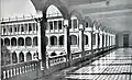The result was a monumental pan-optical edifice with an extensive neoclassical façade perpendicular to the chapel and four large courtyards with three stories of porticoed galleries to link nine radial pavilions. The appearance is of extreme monumentality which is supported both in the design resources and the unusual dimensions of the spaces. The structure is built from concrete-covered steel, the flooring and roof are monolithic reinforced concrete.