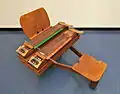 Partch built the Quadrangularis Reversum in 1965, about twenty years after the Diamond Marimba.[13] The central section's 36 African padauk blocks are an upside-down, mirrored version of the Diamond Marimba—hence Reversum. This reverse possibility was shown to Partch by Erv Wilson who helped with its construction. To the left and right are sets of ten alto-register blocks.[16] Bamboo resonators are under the blocks. Partch's initial plan, abandoned due to cost, was to use square bamboo (C. quadrangularis) for the resonators—hence the first part of the instrument's name.[20] The curved uprights are eucalyptus, and the bar across the top is intended to evoke a torii. The instrument is quite large at 103 inches (2.6 m) across the top and 79 inches (2.0 m) tall.[21]