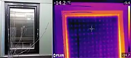 This trade-off does not apply to vacuum insulated glass (VIG), or evacuated glazing,[7] as heat loss due to convection is eliminated, leaving radiation losses and conduction through the edge seal and required supporting pillars over the face area.[8][9] These VIG units have most of the air removed from the space between the panes, leaving a nearly-complete vacuum. VIG units which are currently on the market are hermetically sealed along their perimeter with solder glass, that is, a glass frit (powdered glass) having a reduced melting point is heated to join the components. This creates a glass seal that experiences increasing stress with increasing temperature differential across the unit. This stress may limit the maximum allowable temperature differential. One manufacturer provides a recommendation of 35 °C. Closely spaced pillars are required to reinforce the glazing to resist the pressure of the atmosphere. Pillar spacing and diameter limited the insulation achieved by designs available beginning in the 1990s to R = 4.7 h·°F·ft2/BTU (0.83 m2·K/W) no better than high quality double glazed insulated glass units. Recent products claim performance of R = 14 h·°F·ft2/BTU (2.5 m2·K/W) which exceeds triple glazed insulated glass units.[9] The required internal pillars exclude applications where an unobstructed view through the glazing unit is desired, i.e. most residential and commercial windows, and refrigerated food display cases. VIG equipped windows, however, under-perform due to intense edge heat transfer.[6]