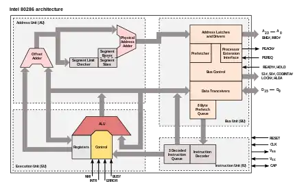 Intel did not expect personal computers to use the 286.[10] The CPU was designed for multi-user systems with multitasking applications, including communications (such as automated PBXs) and real-time process control. It had 134,000 transistors and consisted of four independent units: the address unit, bus unit, instruction unit and execution unit, organized into a loosely coupled (buffered) pipeline, just as in the 8086. It was produced in a 68-pin package, including PLCC (plastic leaded chip carrier), LCC (leadless chip carrier) and PGA (pin grid array) packages.[11]