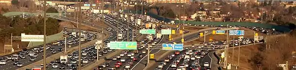 In the field of road transport, an interchange is a road junction that uses grade separation, and typically one or more ramps, to permit traffic on at least one highway to pass through the junction without interruption from other crossing traffic streams. It differs from a standard intersection, where roads cross at grade. Interchanges are almost always used when at least one road is a controlled-access highway (freeway or motorway) or a limited-access divided highway (expressway), though they are sometimes used at junctions between surface streets.