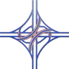 There is a rarely used, unnamed type of interchange using a grade-separated design, similar to the at-grade design known as a "synchronized split-phasing intersection".[7] It is somewhat like the diverging windmill except that left turn exits use left directional ramps, which, as with the diverging windmill, merge on the left. One such interchange formerly existed between Interstate 95 and I-695 north of Baltimore, which has since been replaced by a four-level stack. There are few of these "synchronized split-phasing" interchanges, including one in Birmingham, Alabama, between I-65 and I-20/I-59, locally called Malfunction Junction (33.521505°N 86.826564°W). Another is located in Riyadh, Saudi Arabia, between the Eastern Ring Road and the Southern Ring Road (24.630868°N 46.803215°E). A variation of this type exists in Grand Rapids, Michigan, between Interstate 196 and US 131, where only the opposing carriageways of US 131 cross over each other, while the carriageways for I-196 do not cross over, but pass through the interchange on different levels. Another variation of this type exists in Charlotte, North Carolina, between I-77 and I-85, where only the opposing carriageways of I-77 cross over each other; there are loop ramps from I-77 northbound to I-85 southbound and also from I-77 southbound to I-85 northbound.