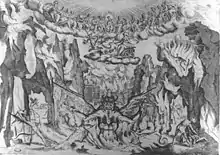 Originally intermedi had used the sets already on the stage from the main play, typically fairly simple ones for a comedy, with a few extra pieces, but later they had their own sets, which a mythological subject required to be more elaborate. Vasari's production for yet another Medici wedding in 1565 "embodied stupendous advances in engineering technique" with all the elaborate movements of scenery done without a curtain in full view of the audience.[5] According to Roy Strong: "the designs for the 1589 intermezzi are crucial, for they are the earliest mass-disseminated illustrations of what became a norm throughout Europe for theatrical visual experience for the next three hundred years, the proscenium arch behind which receded ranks of side wings, the vista closed by a back-shutter."[6] Eventually the form acquired a tradition and cohesiveness that allowed it to stand on its own, and it was thus a logical development to combine the existing features with sung, acted parts, and be absorbed into the new artform of opera, which also drew from the traditions of monody and madrigal comedy. Jacopo Peri, the composer of Dafne, the first opera, was one of the composers, and almost certainly performers, in the 1589 Medici intermezzi, and the librettist for both, Ottavio Rinuccini, seems to have recycled in Dafne some of the material from the 1589 Delos scene (illustrated at top).